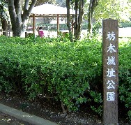 1394年皆川秀光が築城、その後本城の皆川城の支城となったが、小田原征伐で皆川城が廃城となったため、本領安堵された皆川広照が再築城した。広照は家康の6男忠輝の守役となるが、1609年の忠輝改易に連座させられ、城も廃城となった。 JR栃木駅から少し離れたところにある公園。一角に水堀の一部と土塁の一部が残っているだけであり、城というイメージは一切無い。水堀に泳ぐ鯉とこの季節に鳴いていたツクツクボウシが印象的だった。(H16.10.2) |