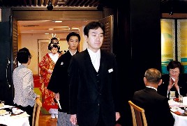 和式の音楽で厳かな雰囲気の中、天満宮会館館長の先導で高砂席へ。